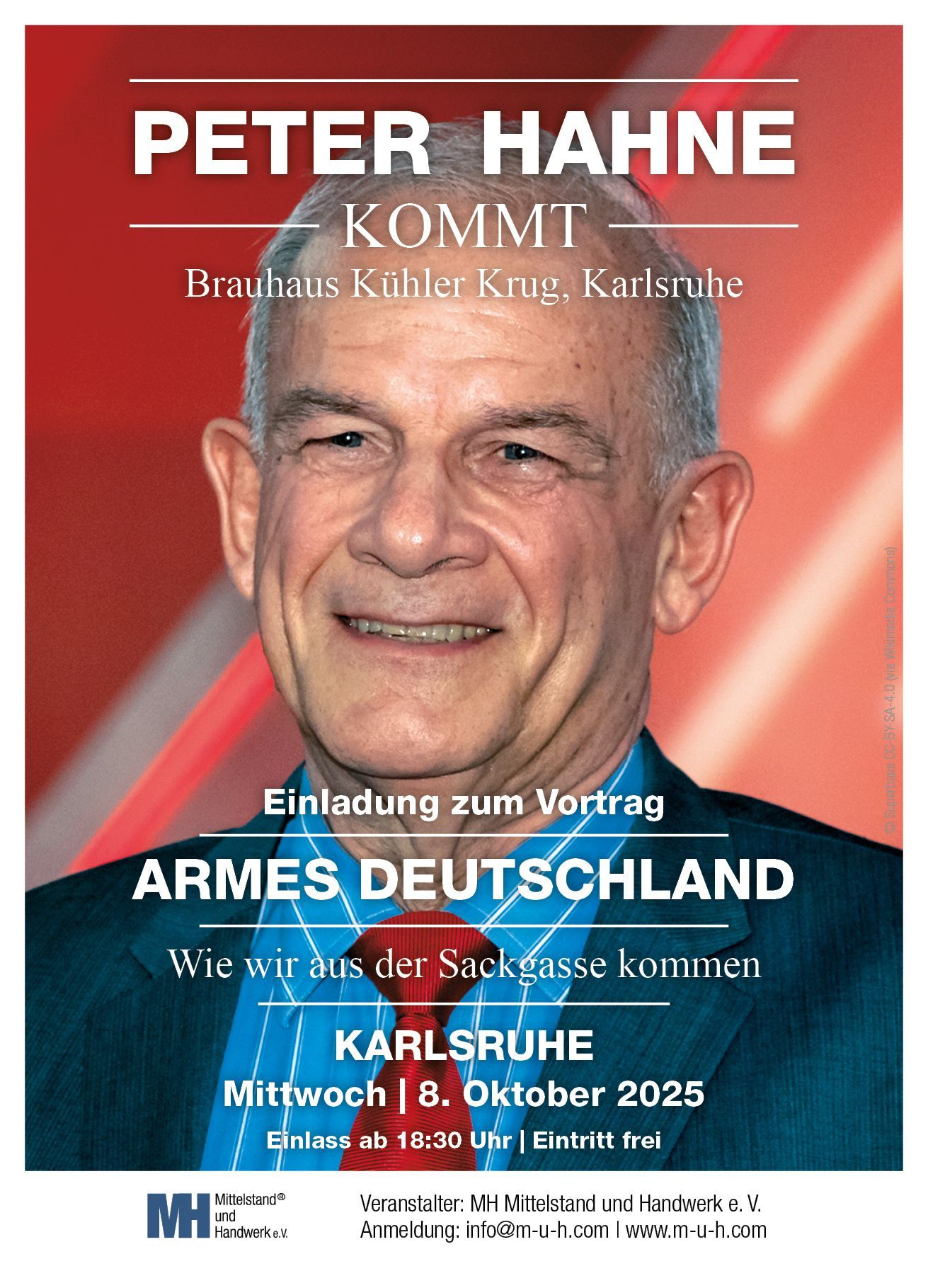 - Am 8.10.2025 PETER HAHNE KOMMT. Thema: Armes Deutschland - Wege aus der Sackgasse, Anmeldung unter info@m-u-h.com